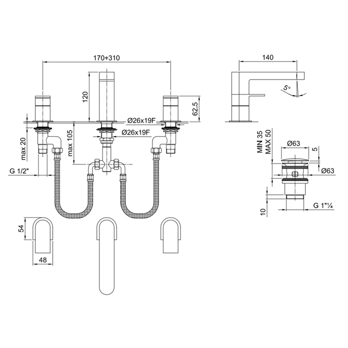 Этот смеситель разработан для установки в три отверстия на раковине или столешнице. Его главной конструктивной особенностью является интегрированный нажимной донный клапан для быстрого слива воды, который управляется отдельной кнопкой. Основные характеристики: