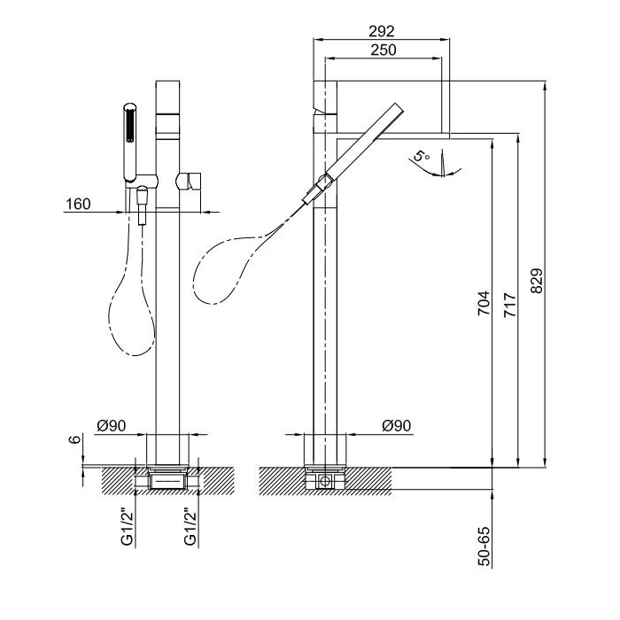 Смеситель монтируется как автономная напольная конструкция рядом с ванной. Для установки требуется подведение стандартных водопроводных труб (½ дюйма) и наличие напольного слива. Важно обеспечить жесткую фиксацию стойки к полу. Рекомендуем профессиональный монтаж.