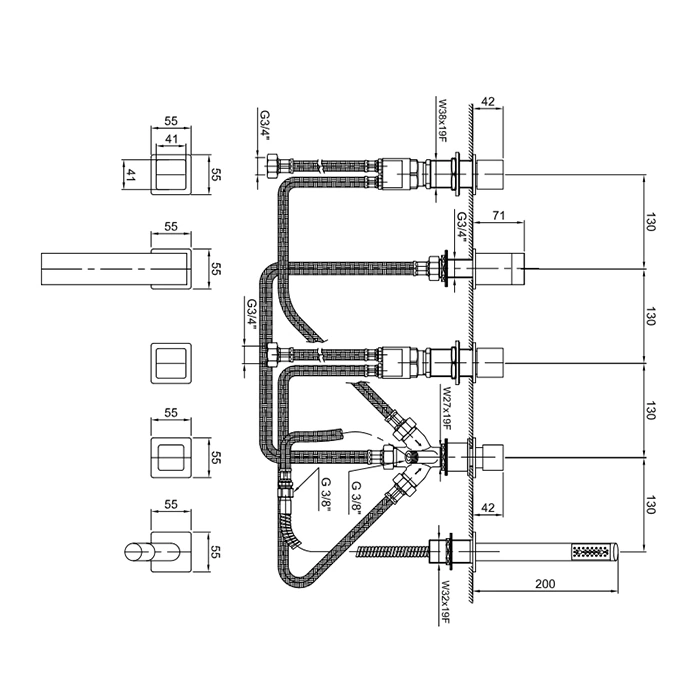 - Конфигурация на 5 отверстий: стандартная схема установки, требующая соответствующей подготовки борта ванны.