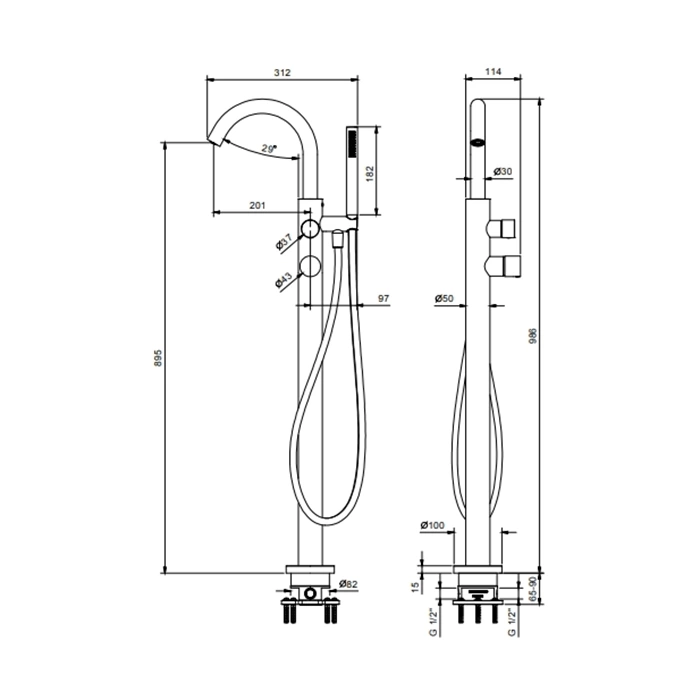Это напольный (стоячий) смеситель, который монтируется непосредственно на пол рядом с ванной. Он требует подвода водопроводных труб и канализации (для слива из ручного душа) через пол. Такой тип установки создает эффектный дизайн и экономит пространство на стенах.