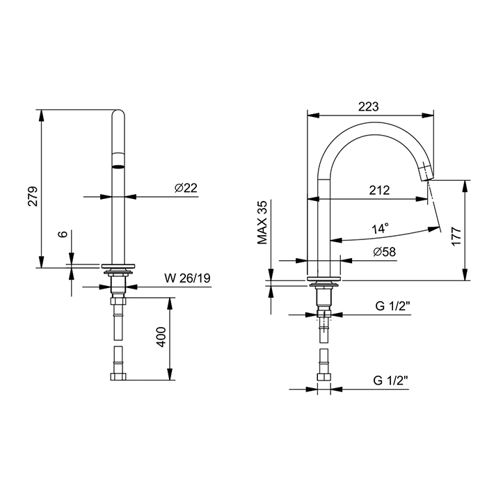 Длина излива составляет примерно 145 мм, высота - около 125 мм. Такие габариты и конструкция обеспечивают удобное пользование раковиной стандартной и увеличенной глубины, предотвращая разбрызгивание воды.