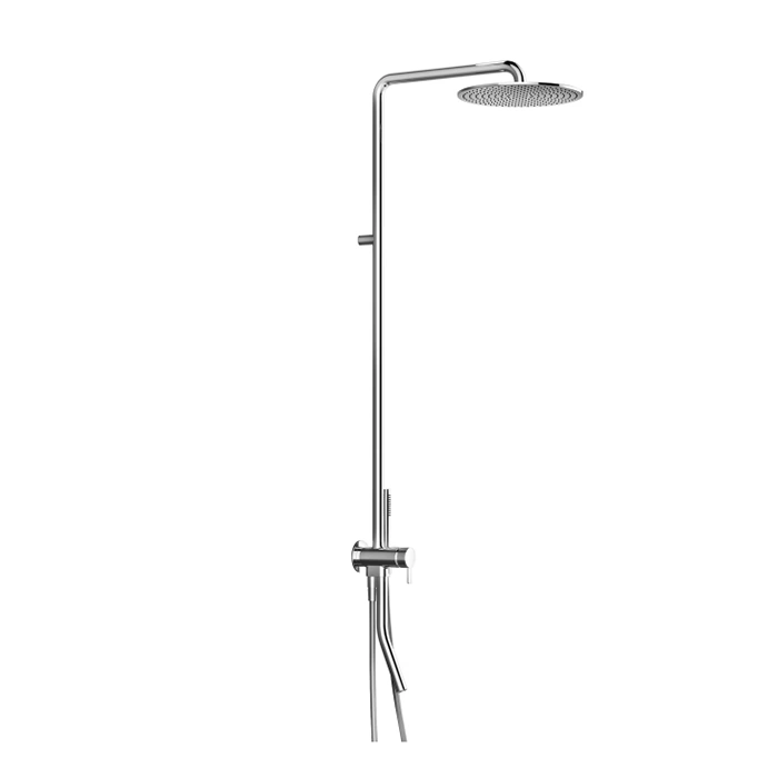 В базовый комплект данной модели входит встраиваемая панель (термостатический или механический картридж уже установлен), верхний душ диаметром 300 мм с креплением и шлангом, а также необходимые декоративные элементы и крепеж для монтажа. Излив (если он предусмотрен в конкретной модификации) и настенная стойка для душа обычно приобретаются отдельно.