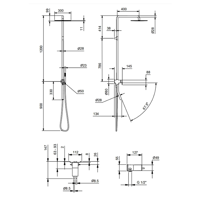 - Верхний душ 300 мм: Большая квадратная насадка обеспечивает роскошный тропический душ с равномерным, насыщенным потоком воды.