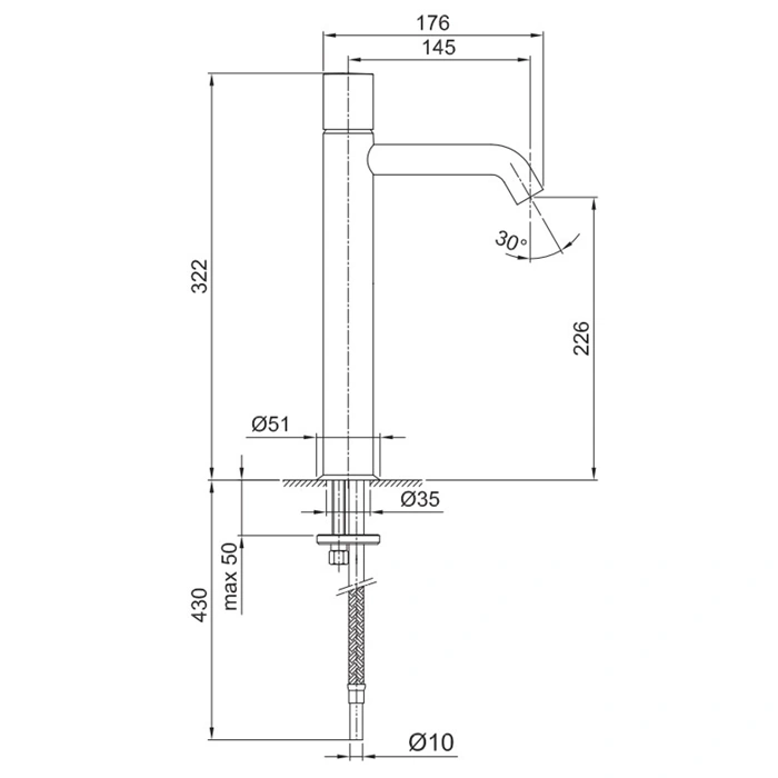 Длина излива составляет 145 мм. Это компактный и эргономичный размер, который отлично подходит для стандартных раковин, обеспечивает достаточный вынос для комфортного пользования и помогает экономить пространство.