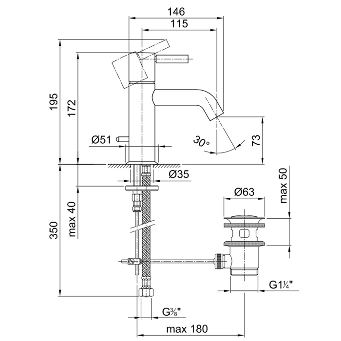 Данная модель предназначена для установки на раковину или столешницу. Стандартное межосевое расстояние для подключения подводок - 102 мм. Монтаж требует одного или двух монтажных отверстий (в зависимости от конструкции раковины) для установки корпуса смесителя и механизма управления донным клапаном.