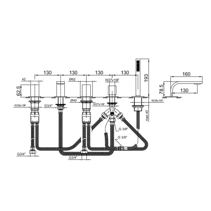 - Тип монтажа: На борт ванны/инсталляцию (5 отверстий).