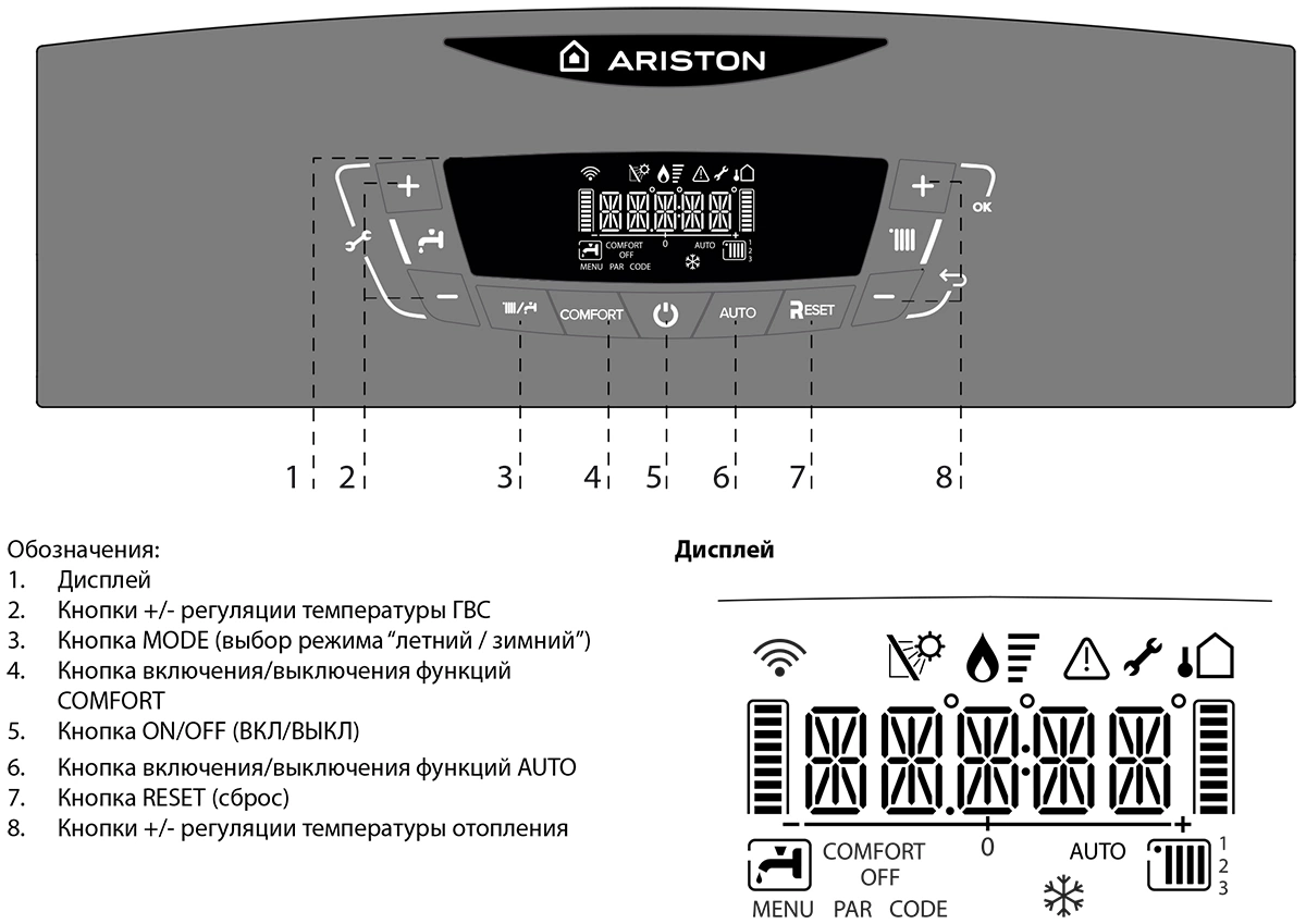 - Функция «КОМФОРТ» ускоряет подачу горячей воды при подключении внешнего бойлера — горячая вода доступна в течение нескольких секунд
