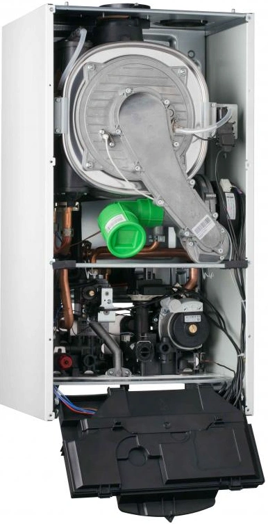 - Готовое решение для ГВС. Встроенный высокопроизводительный пластинчатый теплообменник обеспечивает стабильную подачу горячей воды, даже если открыты несколько кранов одновременно.
