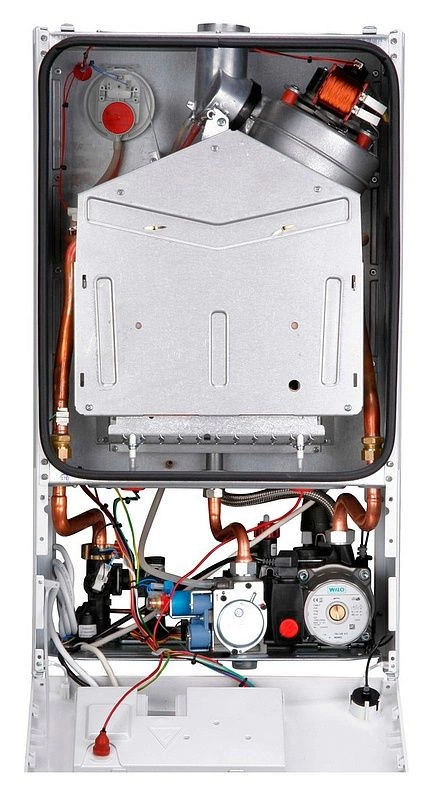 - Газовый двухконтурный котел оснащён встроенным пластинчатым теплообменником. Это обеспечивает высокую производительность при ГВС — до 11,4 литра горячей воды в минуту.