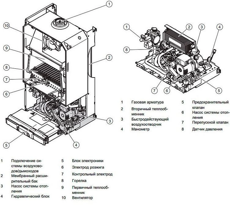 - Два теплообменника — один отвечает за отопительный контур, второй быстро подогревает воду на хозяйственные нужды