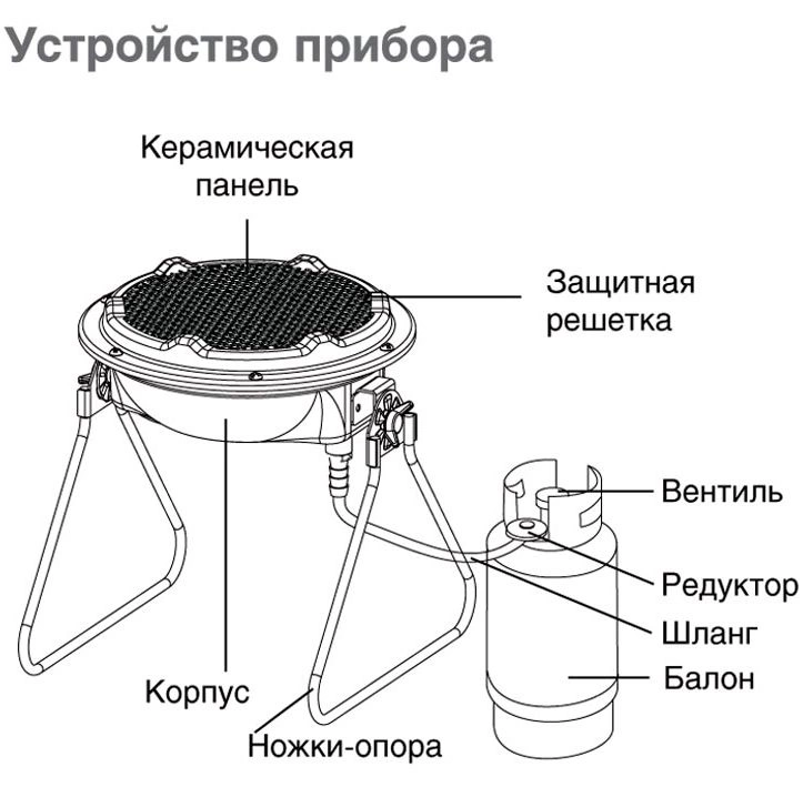 Сердцем устройства является горелка из нержавеющей стали, устойчивая к высоким температурам и коррозии. Она нагревает керамическую излучающую панель, которая генерирует инфракрасные лучи. Эта панель обладает высокой теплоотдачей и долгим сроком службы.