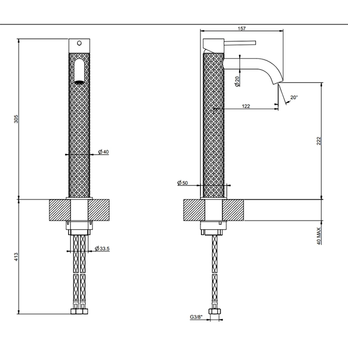Смеситель для умывальника GESSI 316 предназначен для установки на вертикальную поверхность с межосевым расстоянием подключения 102 мм. Для работы требуется стандартное холодное и горячее водоснабжение с давлением до 5 бар. Монтаж рекомендуется доверить квалифицированному сантехнику.