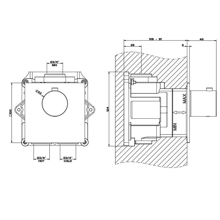 Данная модель предназначена для подключения к одному источнику воды, что делает ее идеальным решением для душевой зоны или современной ванны. Резьба подключения 3/4" является стандартной и совместима с большинством сантехнических систем. Встраиваемая арматура требует установки в специальную монтажную коробку или нишу, что позволяет создать минималистичный интерьер с аккуратными, чистыми линиями. Наружу выходят только элегантные рукоятки и излив.