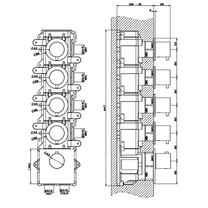 Модель 54508#239 предназначена для управления четырьмя источниками воды (например, душ, верхний душ, ручной душ, потолочная лейка). Заранее спланируйте и согласуйте с дизайнером или монтажником схему коммутации. Ошибка на этапе проектирования разводки труб приведёт к переделкам и дополнительным затратам после чистовой отделки.