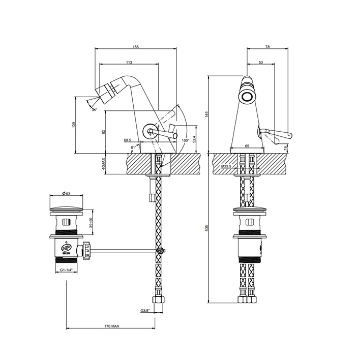 Смеситель для биде Gessi Cono с донным клапаном 1 1/4 и шлангами 3/8