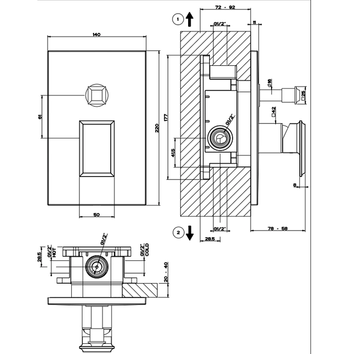 Встраиваемая конструкция смесителя Gessi Eleganza требует профессиональной установки. Все функциональные элементы, включая термостатический или комбинированный картридж и автоматический переключатель, монтируются в стену. На виду остается только излив и элегантная шильда управления.