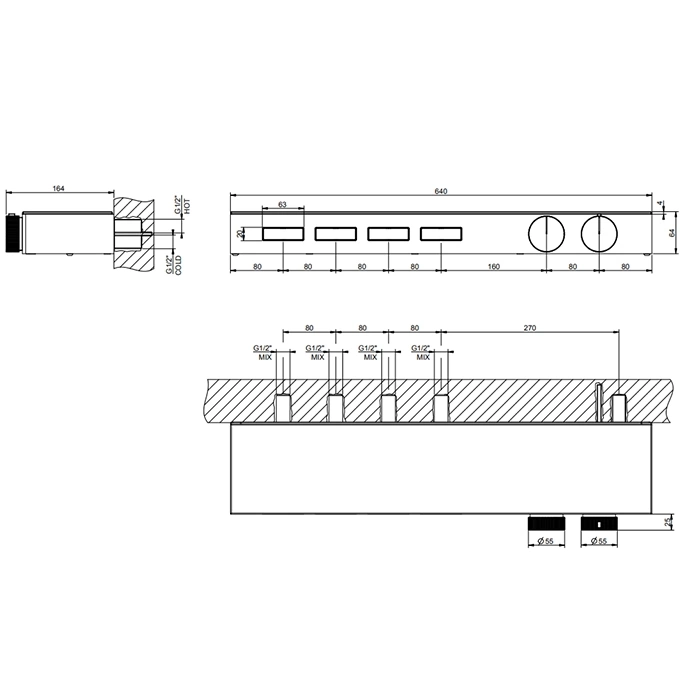 В базовый комплект входят: термостатический смесительный клапан, декоративная панель управления с ручками, полка из матового стекла, внутренний картридж и необходимый набор для монтажа. Окончательную комплектацию, а также настенные плиты и скрытые элементы установки (инсталляцию) рекомендуется уточнять перед покупкой.