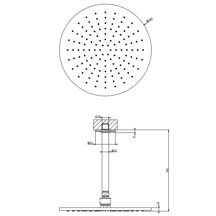 Диаметр душевой головки GESSI INCISO составляет 300 мм. Это стандартный и популярный размер, который подходит для большинства душевых кабин и просторных душевых зон. Перед покупкой рекомендуем замерить свободное пространство на потолке вашей душевой.