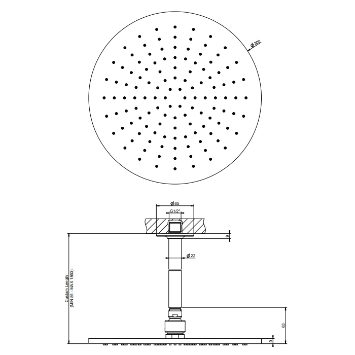 Стандартный размер панели - 300 мм. Главная уникальность модели - опция изготовления под заказ. Длина трубы, подающей воду от выхода в стене до самой головки, может варьироваться от компактных 105 мм до впечатляющих 1855 мм. Это решает сложные задачи планировки и позволяет установить душ точно над центром поддона или ванны, независимо от расположения коммуникаций.