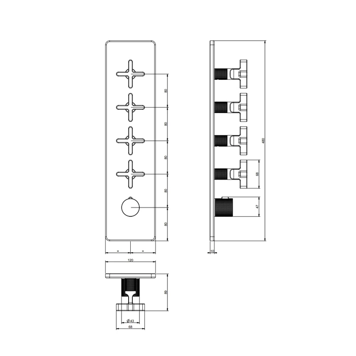 Четыре выхода с резьбой ¾" предназначены для подключения нескольких точек водозабора: например, верхнего душа, ручного душа, излива и дополнительной функции. Это решение для создания сложных и многофункциональных душевых систем.