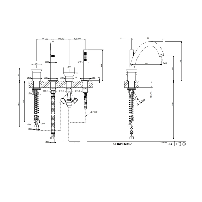 Данная модель GESSI Origini предназначена для установки на ванну или комбинированную поверхность (ванна+раковина) и требует подготовленных 4 отверстий стандартного межосевого расстояния для крепления корпуса смесителя, излива и держателя лейки.