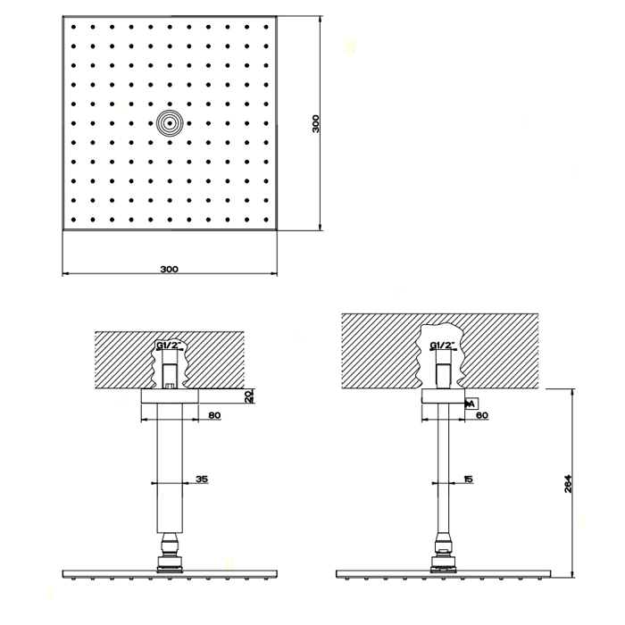 Основу верхнего душа составляет литая латунная решетка размером 300x300 мм. Поверхность обработана гальваническим хромированием по технологии, обеспечивающей высокую стойкость к коррозии и механическим повреждениям. Внутренние каналы спроектированы для минимизации потерь давления.