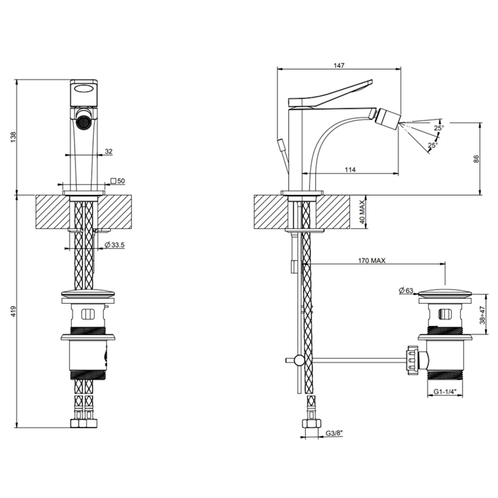 Смеситель для биде GESSI с донным клапаном спроектирован для легкой установки на борт сантехнического прибора. Все необходимые крепежные элементы и экраны входят в комплект.
