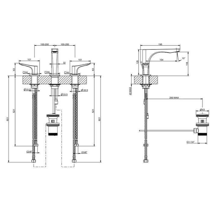 Общая высота смесителя GESSI Rilievo от основания до верхней точки составляет 125 мм. Длина излива (носика) равна 154 мм, что обеспечивает комфортную глубину раковины для мытья рук и предотвращает разбрызгивание.