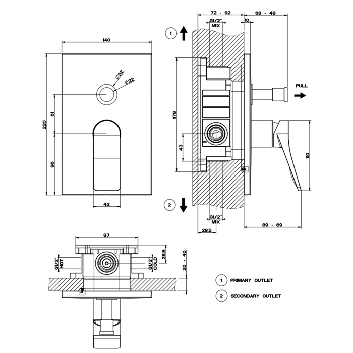 - Скрытый монтаж: Все коммуникации и основной корпус надежно скрыты в стене, что защищает их от внешних воздействий и визуально разгружает пространство.