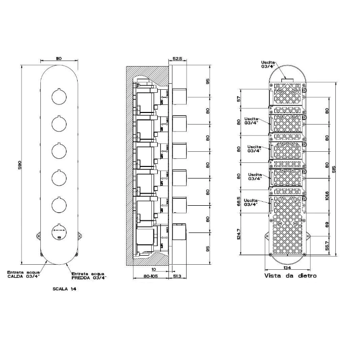 Встраиваемый термостат для душа Gessi Tondo с 5 выходами