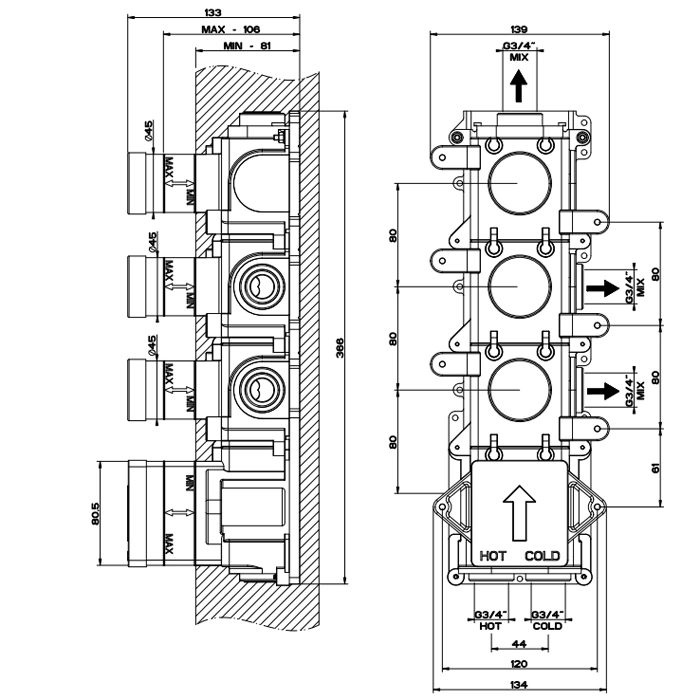 Три выхода позволяют одновременно подключить несколько точек водозабора. Например, можно направить воду на основной излив (ванну), ручной душ и верхний душ (лейку) или биде. Управление осуществляется элегантными переключателями, что создает профессиональный спа-эффект и высочайший уровень комфорта в ванной комнате.