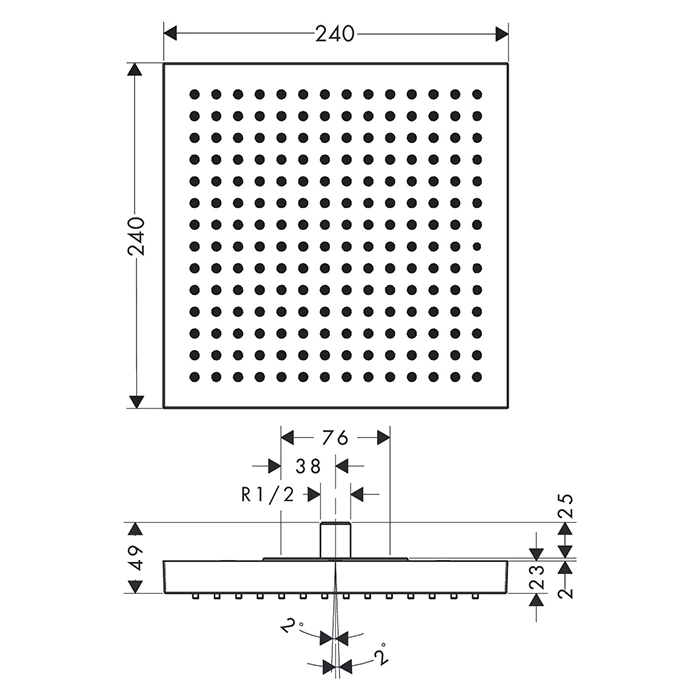 Размер панели составляет 240x240 мм. Это компактная и универсальная модель. Для монтажа необходимо убедиться, что в выбранном месте душевой кабины или над ванной есть достаточное свободное пространство на стене, а также подведена необходимая скрытая или наружная водопроводная разводка. Рекомендуем свериться с планом размещения.