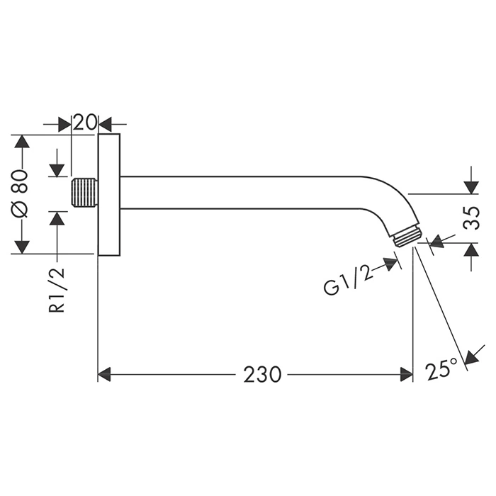 Длина выноса (в данном случае 230 мм). Этот параметр определяет, насколько далеко от стены будет находиться душ. 230 мм - оптимальная величина для комфортного пользования и монтажа над ванной или в душевой кабине.