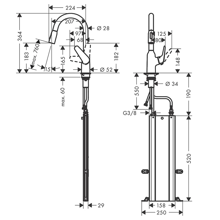 Система выдвижного душа Hansgrohe надежна и оснащена защитой от протечек благодаря качественным соединительным элементам и прочному шлангу в металлической оплетке.