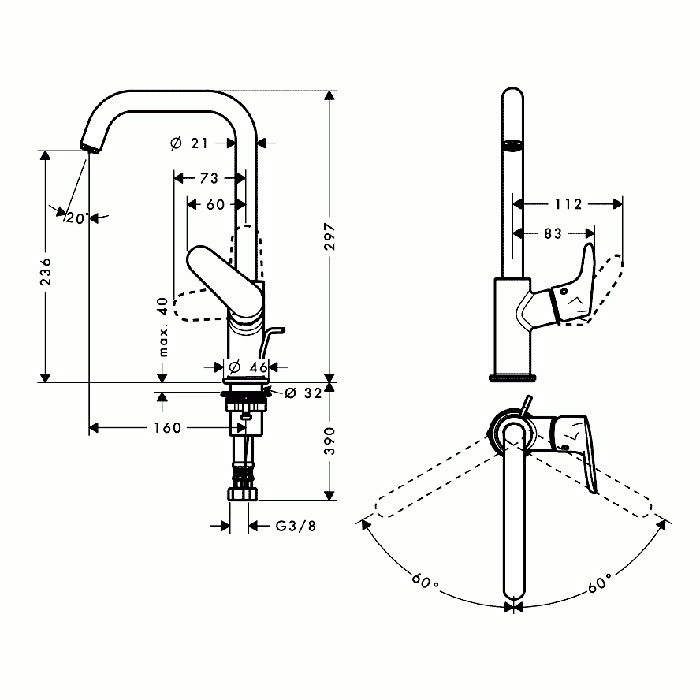 - Высокий вращающийся излив обеспечивает отличную маневренность и комфортное наполнение даже крупной посуды.