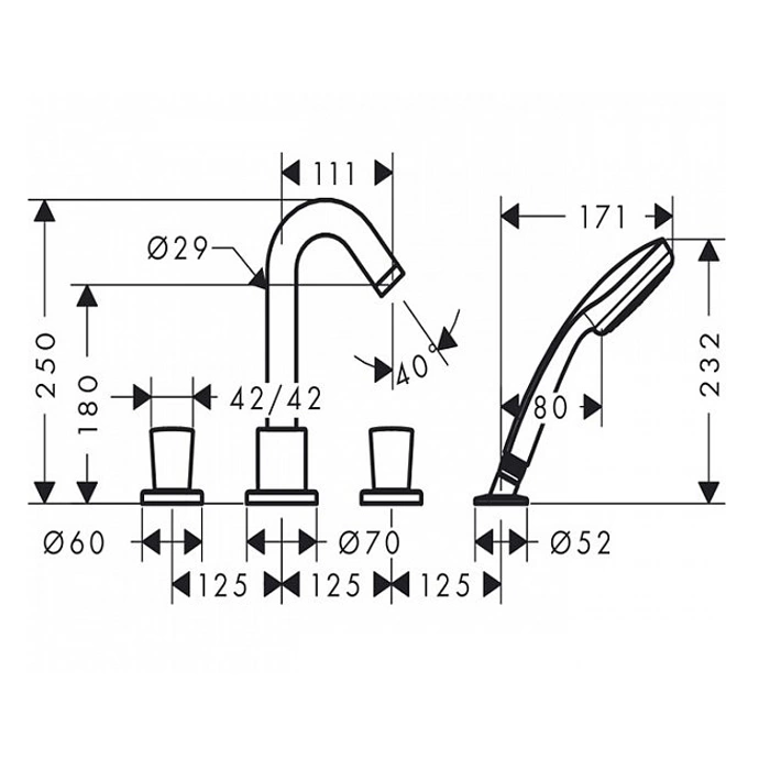 Смеситель для ванны Hansgrohe Logis с ручным душем 1jet, на 4 отверстия, излив 125 мм, хром (71314000)