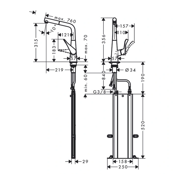 Hansgrohe Metris M71 предназначен для стандартного однорычажного монтажа на раковину или столешницу. Диаметр монтажного отверстия должен составлять 35 мм. Модель подходит для большинства стандартных кухонных моек.