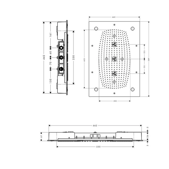 Размер панели и покрытие. Наша модель 680x460 мм - оптимальна для стандартных и просторных душевых. Хромированное покрытие не просто для красоты - оно устойчиво к известковому налету и легко чистится, что важно для выбора душевой системы на долгие годы.