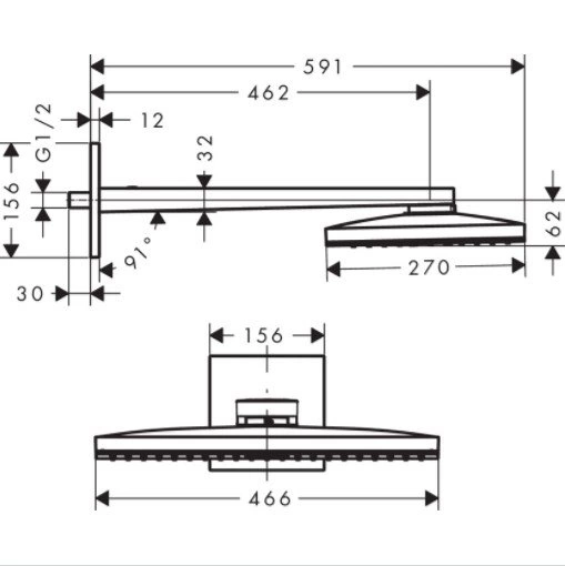 Верхний душ 466x270 мм монтируется на стену или боковину душевой кабины. Для подключения требуется стандартная подводка 1/2". Совместим с большинством термостатических и механических смесителей для ванны и душа, что делает его универсальным решением. Надежный держатель обеспечивает прочную фиксацию лейки в нужном положении.
