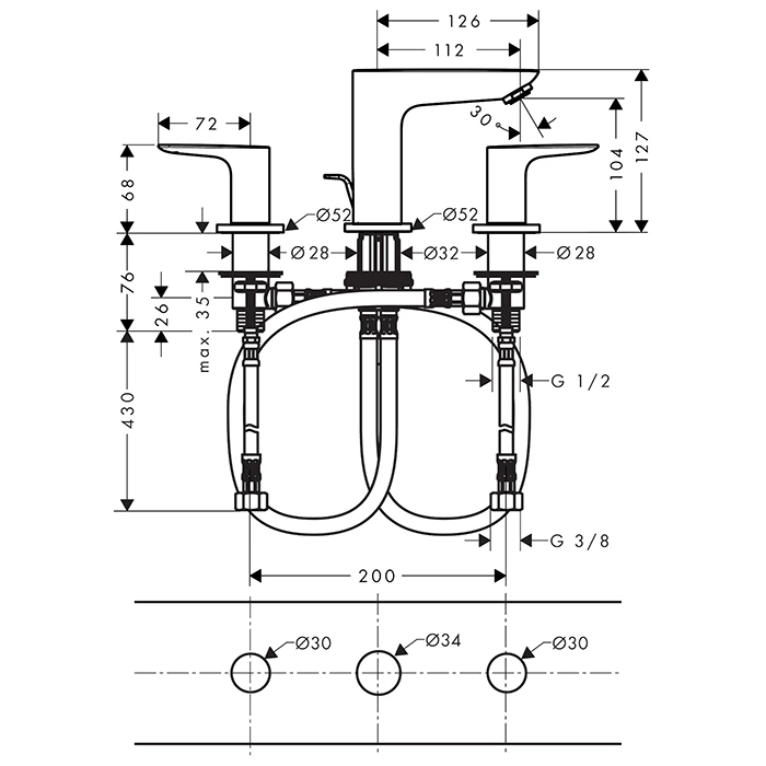 Модель 71733140 предназначена для монтажа в раковину или столешницу с тремя монтажными отверстиями. Стандартное межосевое расстояние между отверстиями под рычаг и излив составляет 150 мм, что является распространенным стандартом. Третье отверстие предназначено для подключения перелива (если он есть у вашей раковины) или может быть закрыто заглушкой.