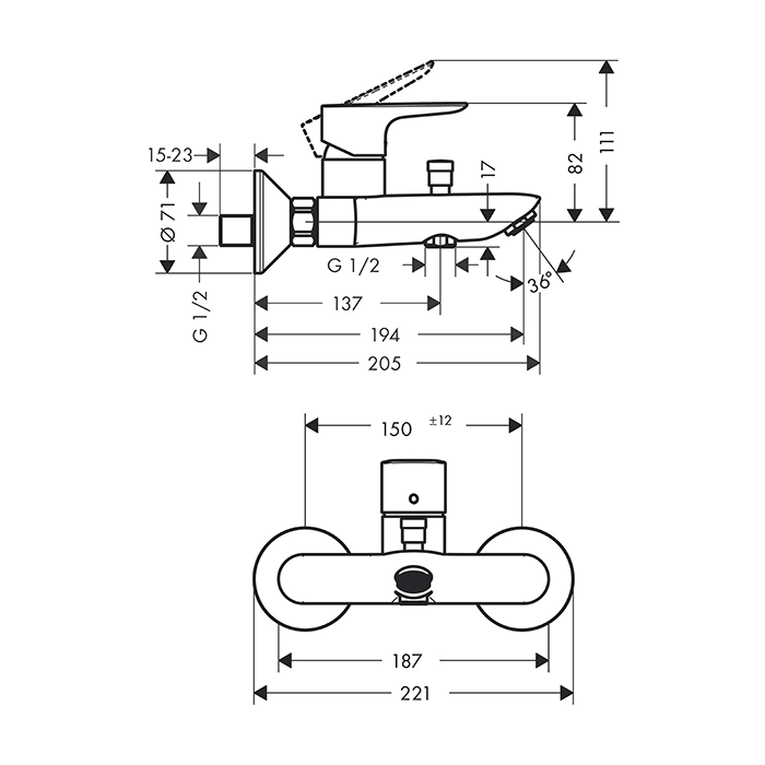 Длина излива составляет 194 мм. Такой размер считается оптимальным для ванны, обеспечивая достаточный вылет для комфортного набора воды и мытья головы, при этом смеситель компактно смотрится на стене. Высокий угол подъема излива предотвращает забрызгивание.