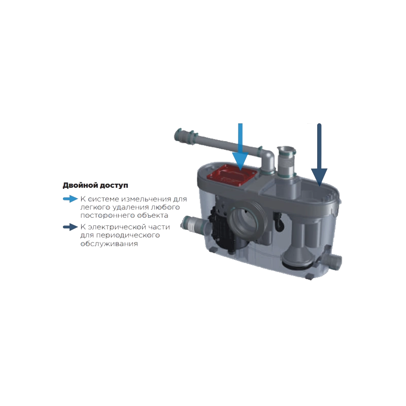 Устройство монтируется за унитазом или скрыто в нише. При смыве включается мощный двигатель, а острое лезвие-измельчитель мгновенно перемалывает органические отходы и гигиенические средства в однородную массу. Это позволяет перекачивать стоки по тонким трубам диаметром 22/28/32 мм на большое расстояние или на высоту.