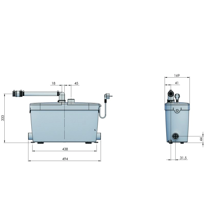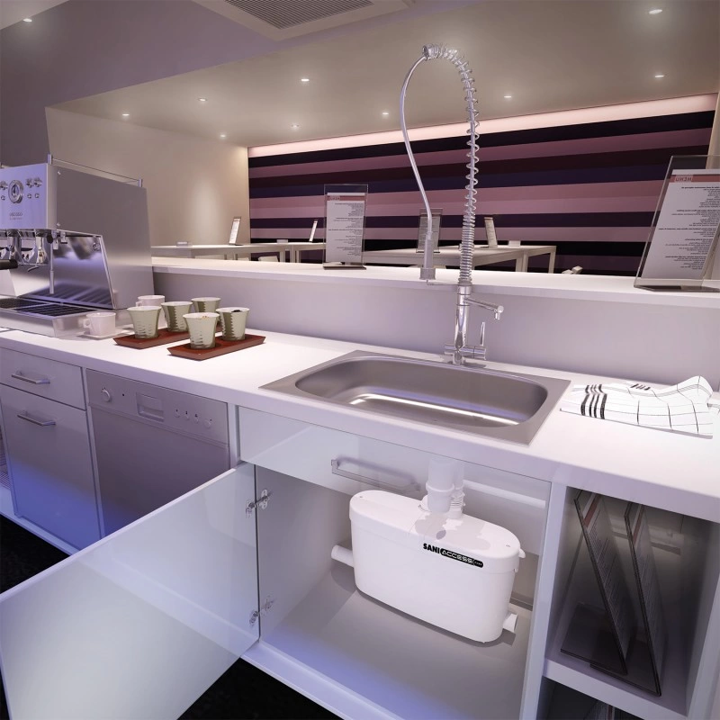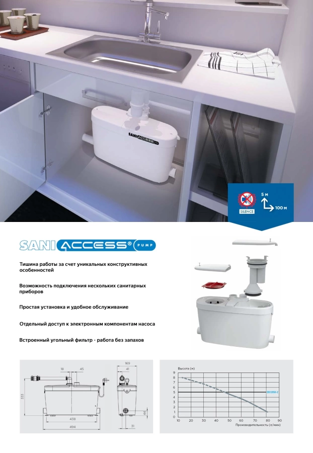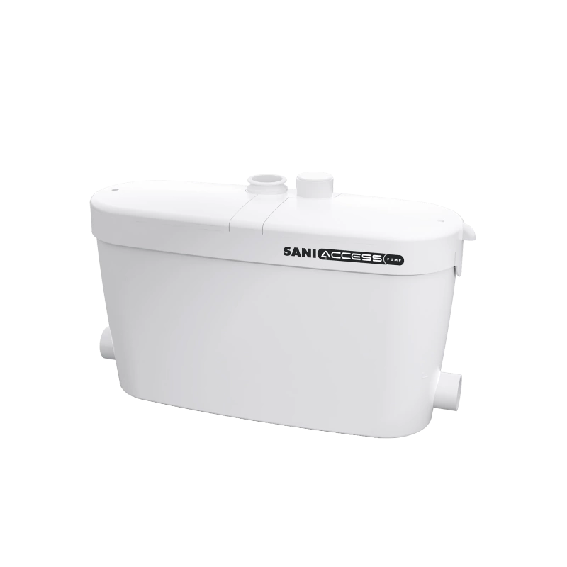 Saniaccess Pump разработан для подключения к унитазу с горизонтальным или вертикальным выпуском, а также для отвода стоков от раковины, душевой кабины, биде, стиральной или посудомоечной машины. Модель оснащена угольным фильтром, нейтрализующим запахи. Система работает бесшумно, что важно для установки в жилых помещениях.