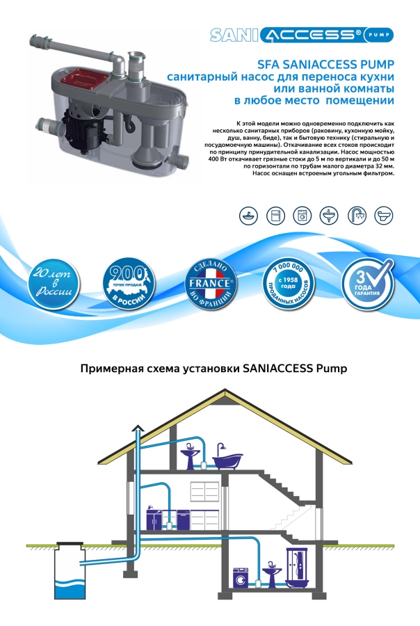 Канализационный насос SFA Saniaccess Pump - это готовое техническое решение для организации принудительной канализации. Сочетание достаточной мощности, надежного измельчителя и компактных размеров делает его пригодным для монтажа в сантехнический шкаф или нишу. Оборудование решает задачу отвода серых и черных стоков там, где самотечная система невозможна, обеспечивая долгосрочную и беспроблемную эксплуатацию.
