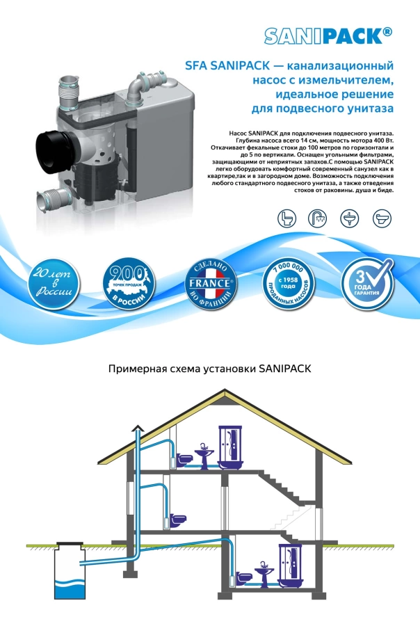 SFA Sanipack — это надежное инженерное решение для создания полноценной канализационной системы независимо от расположения основных коммуникаций. Устройство обеспечивает комфорт и расширяет границы планировки вашего жилья.