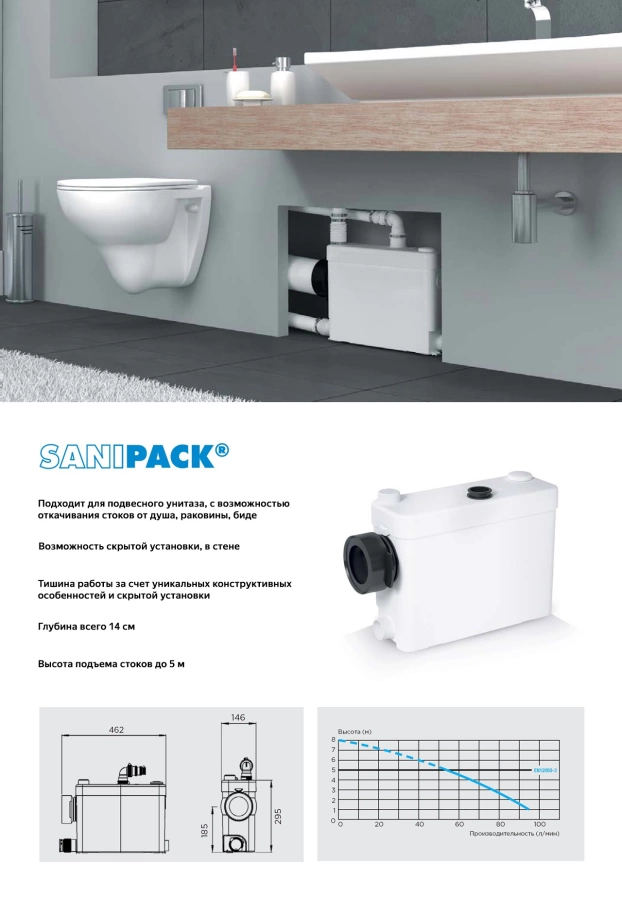 Модель Sanipack подключается к унитазу с горизонтальным или вертикальным выпуском, а также имеет дополнительные впускные отверстия для раковины, душа или биде. Для монтажа достаточно труб диаметром 22/28 мм или 32/40 мм, что значительно упрощает прокладку коммуникаций.