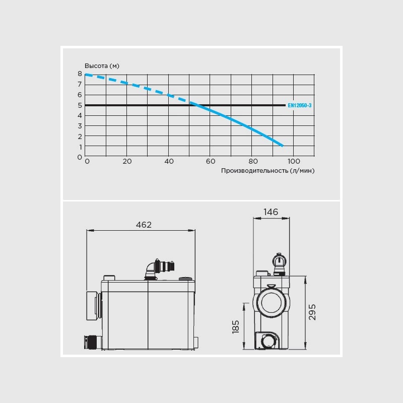 Устройство принимает стоки, измельчает твердые включения с помощью режущего механизма и перекачивает массу по трубам малого диаметра вверх на высоту до 5 метров или в сторону на расстояние до 100 метров. Это позволяет монтировать систему без масштабных строительных работ.