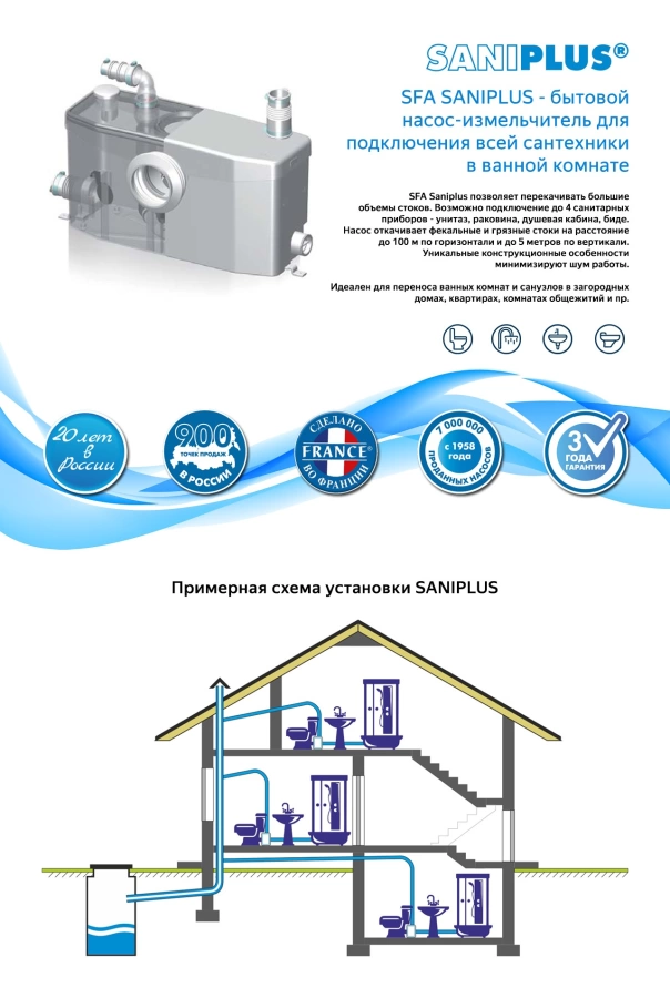Эта модель идеальна для оборудования дополнительной ванной комнаты или гостевого санузла в подвале, на цокольном этаже или в пристройке. Она становится оптимальным решением при перепланировке квартиры, когда нужно перенести туалет в новое место. Надежность и тихая работа делают SFA Saniplus выбором для жилых помещений, где комфорт стоит на первом месте.