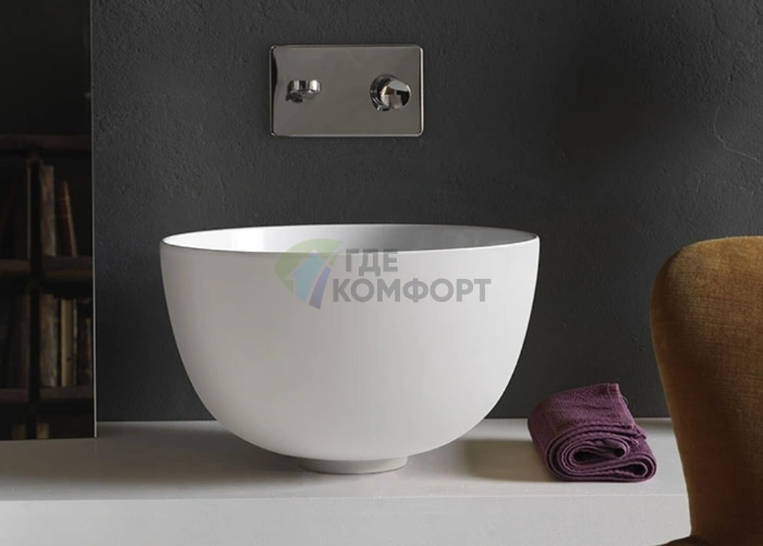 Это готовая к установке чаша, которая монтируется поверх столешницы. В стандартную комплектацию данной модели входит сифон для отвода воды. Смеситель, крепежные элементы и другие аксессуары необходимо подбирать и приобретать отдельно, что дает свободу в создании идеального дизайна для вашей ванной.