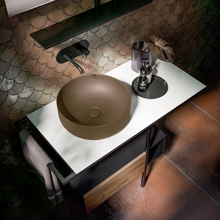 Лайфхак 2: Акцент на текстуру. Играйте на контрастах. Грубоватая матовая поверхность раковины Bruno Matt идеально сочетается с глянцевой плиткой на стене, медными или матово-черными деталями смесителя и светильников.